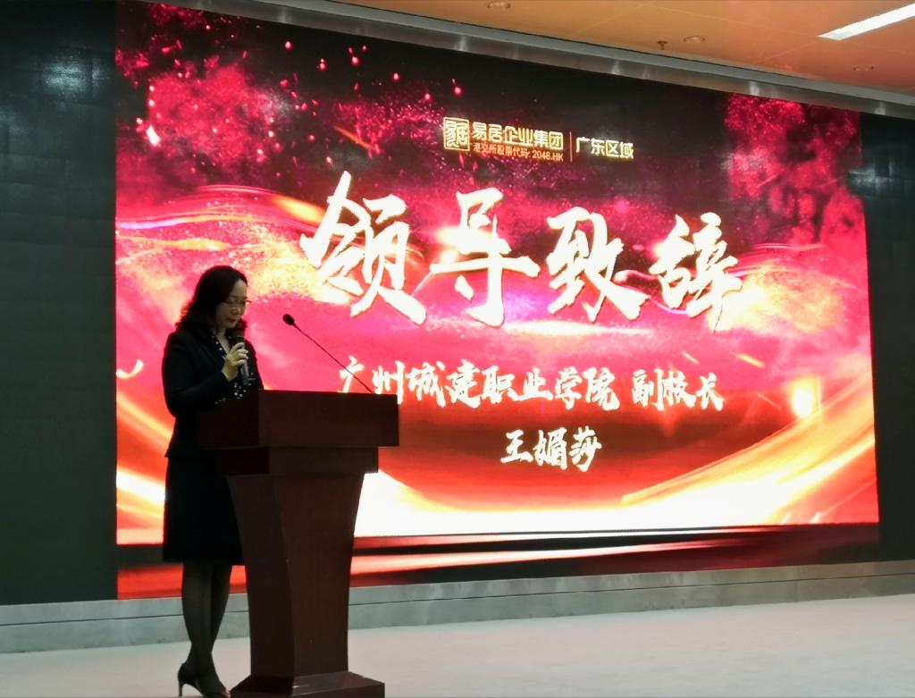 副校长王媚莎在讲话中指出,我校与易居集团开展了近10年的深度合作,累计为企业输送了255名优秀学子,其中10%成为企业的销售冠军。她表示,城建学院毕业生所取得的优秀业绩离不开老师们的悉心教导,离不开企业的精心培养。她强调,要抓住国家大力发展职业教育的契机,打造以市场营销国家骨干专业牵头的“数字地产管理专业群”,实现校企双方合作领域的提质升级,为培养面向粤港澳大湾区发展需要的复合型技术技能人才的目标努力奋斗。