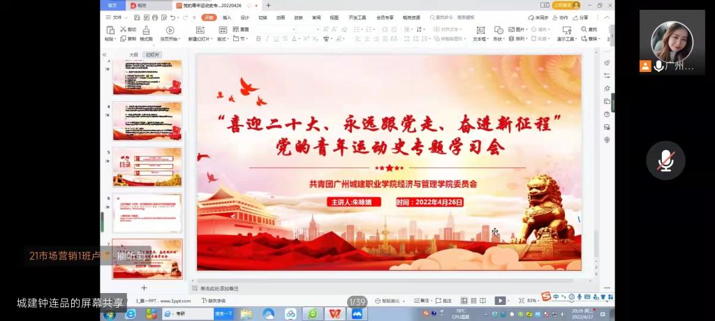 为了宣传、贯彻好习近平总书记对新时代青年和青年工作的期望要求,着力引导团员青年全面认知党领导青年运动的光辉历程,充分感悟习近平总书记的关心关爱,清醒认识自身肩负的历史使命,不断增强争做堪当民族复兴重任的时代新人的思想自觉和行动自觉。4月27日晚,经济与管理学院团委采用线上线下相结合会议形式,开展“喜迎二十大、永远跟党走、奋进新征程”党的青年运动史专题学习会。经济与管理学院团委书记朱咏娟作学习分享,19级、20级、21级共2000余名共青团员参与线上线下学习。