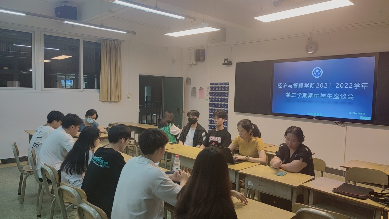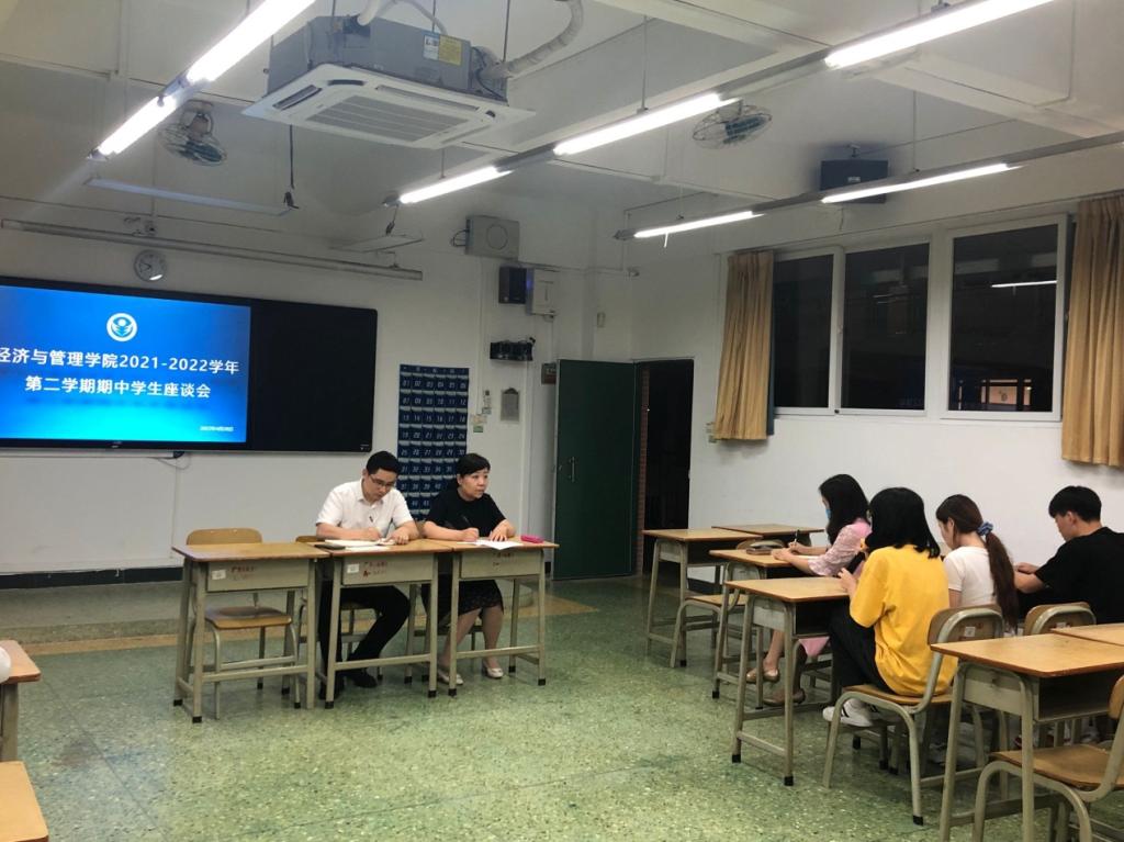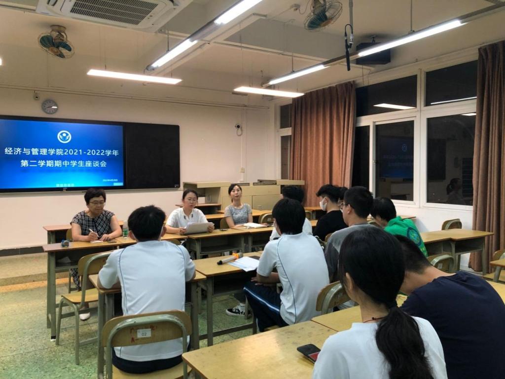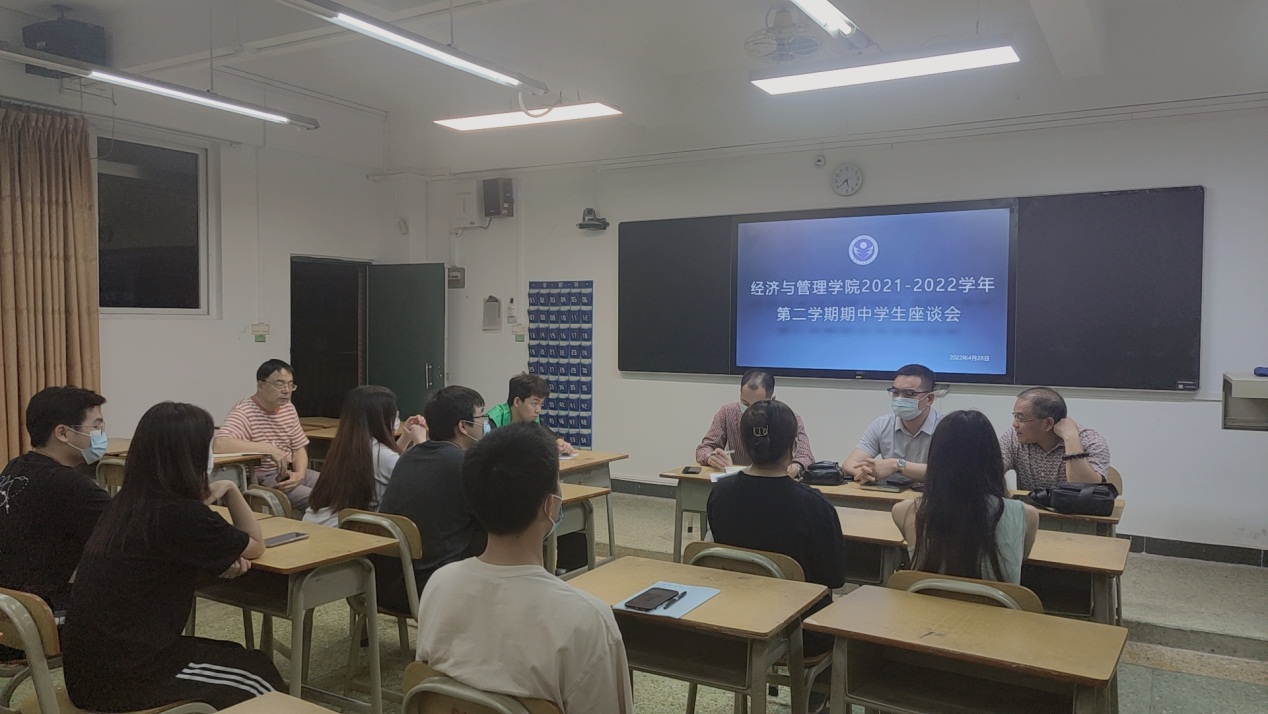 为深入了解自开学以来我院教师课堂教学情况和学生学习现状,进一步规范教学管理,做好教学质量的监控,经济与管理学院于2022年4月28日晚上在人文艺术楼召开了2021-2022学年第二学期期中教学检查暨师生面对面座谈会。经济与管理学院院长沈华艳,副院长陈明发、张珊、欧志勇,办公室主任陆伟林、学校质量办专职督导关晓燕、韩明,教研室主任、学院教学质量评价组成员以及来自2020、2021级的学生代表参与了此次座谈会。座谈会以专业班级为单位,分6个会场举行,由各教研室主任主持,学院领导分别参加了对口联系教研室的会场。