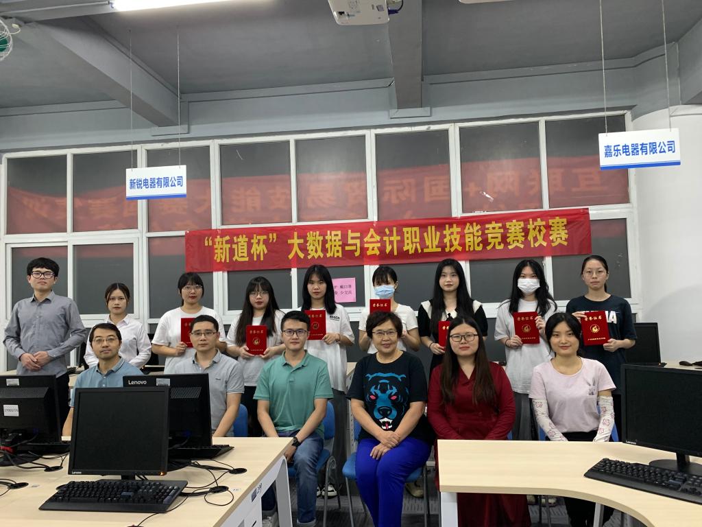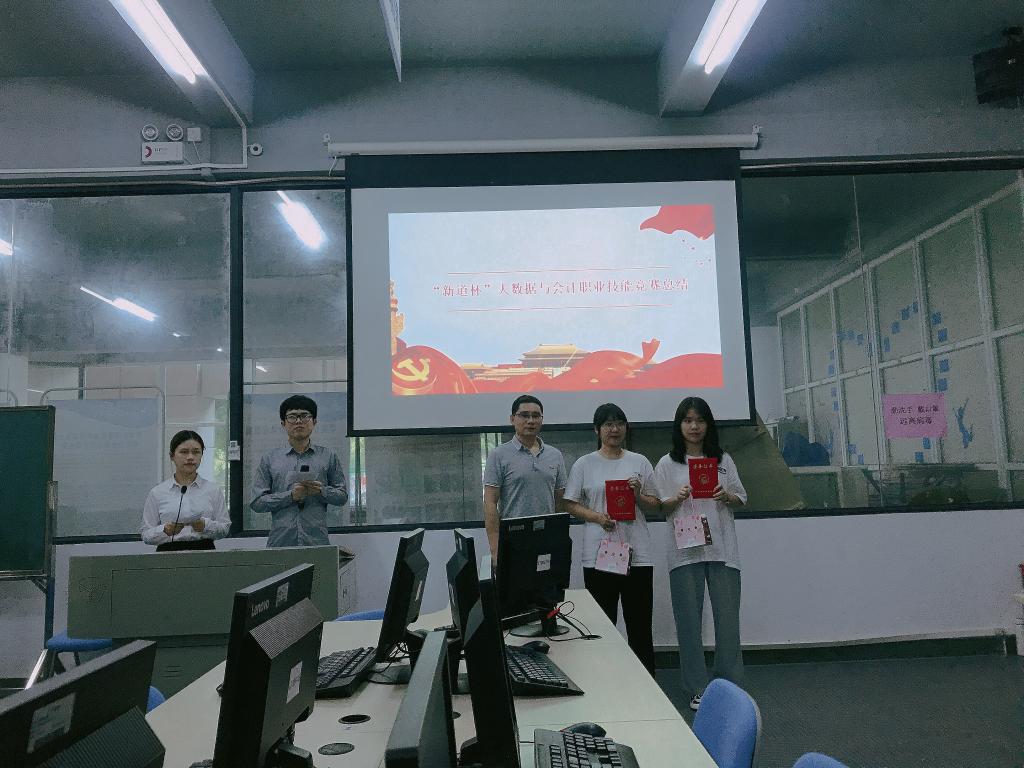 新道科技的陶醉、李嘉敏和大数据与会计教研室的老师们一一为获奖选手颁发荣誉证书及奖品。