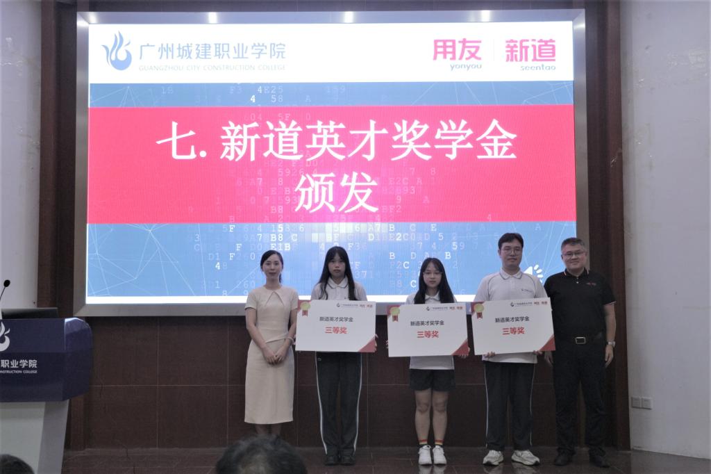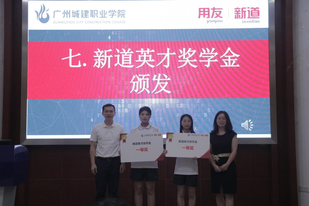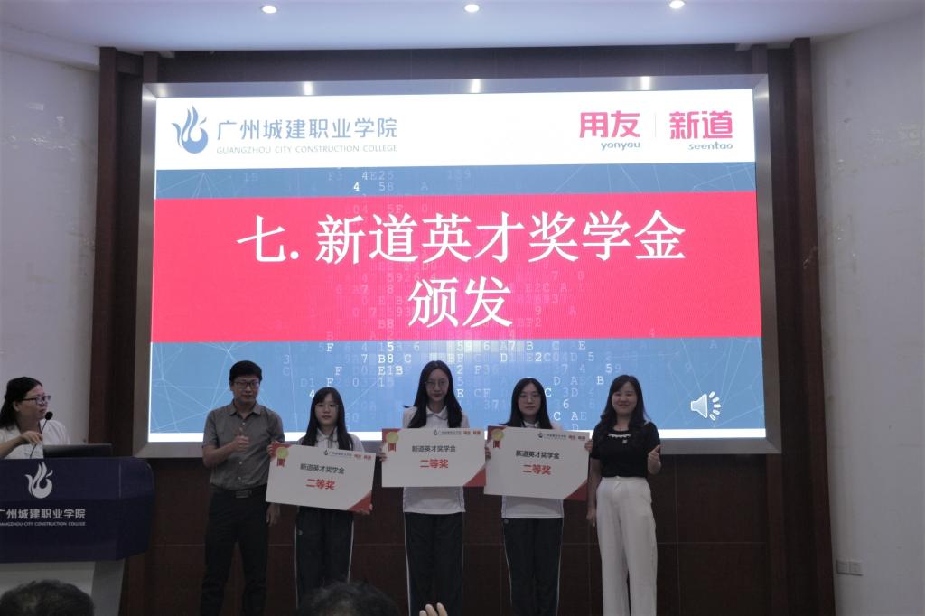 为培养学生们的创新精神和实践能力,鼓励优秀学生拔尖领跑,发挥先进典型的示范导向作用,新道科技公司专门设置了“新道英才奖学金”。会上校企双方领导为2020级和2021级获得新道英才奖学金的同学进行颁奖。