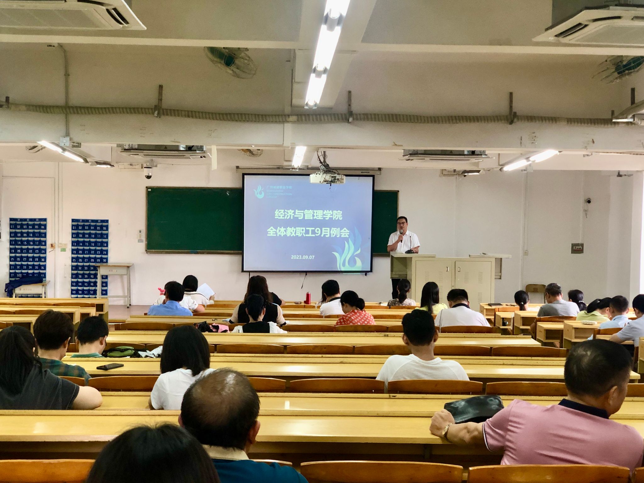 为更好地统筹安排新学期各项工作,谋划开局新篇,9月7日下午,经济与管理学院在人文艺术楼1526课室召开了全体教职工例会。经济与管理学院院长沈华艳,学院党委书记、副院长欧志勇,副院长刘静、张珊及全体教职工参加会议,会议由办公室主任陆伟林主持。