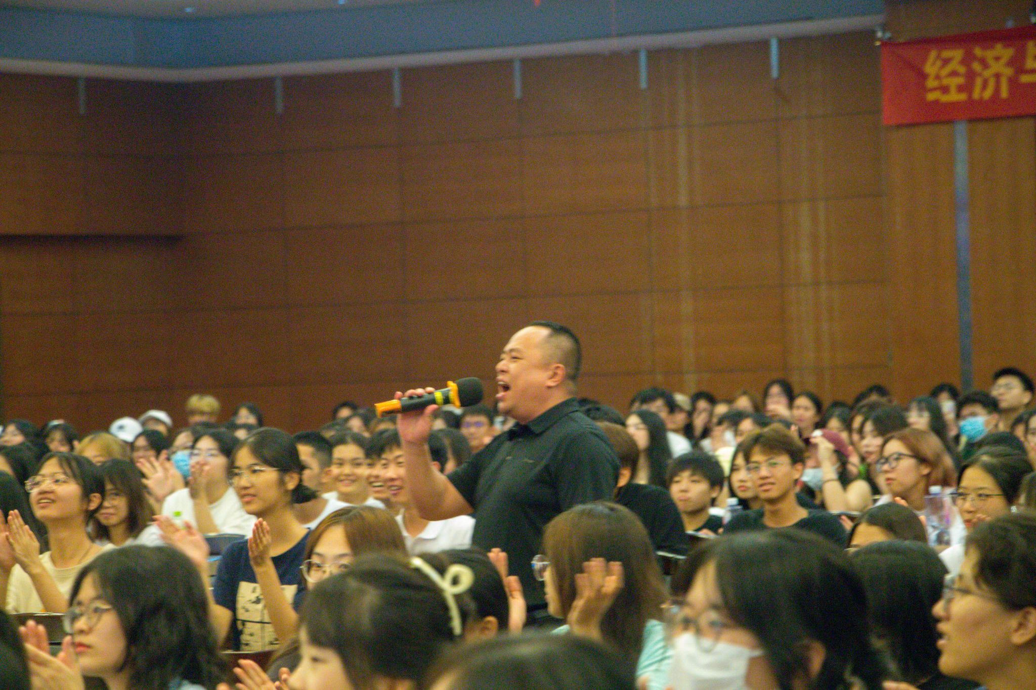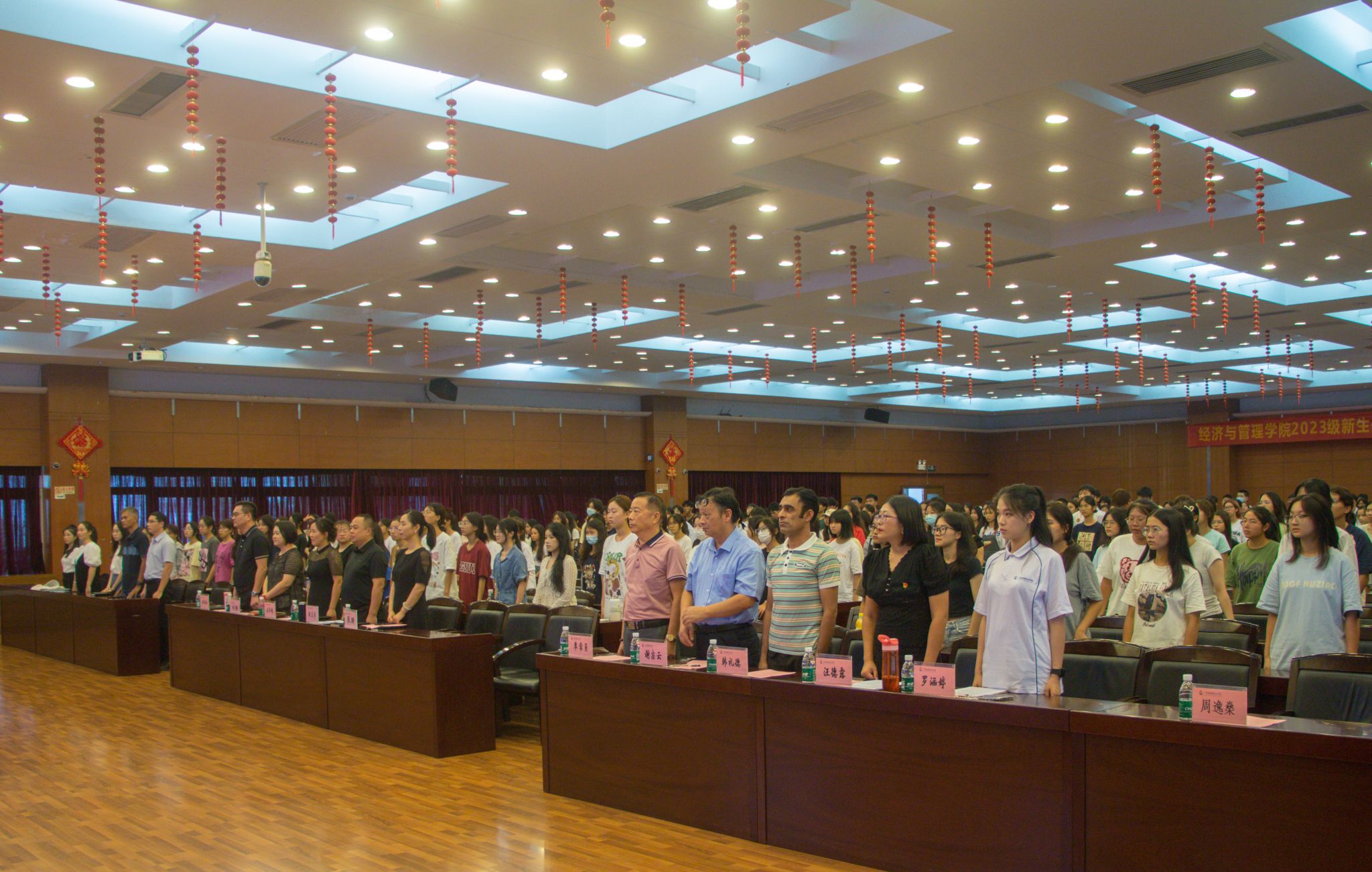 开学典礼上,学院党委代表欧志勇与辅导员代表戚景山老师为全体新生献唱《不再犹豫》歌曲,送上学院最真挚的期盼,希望同学们不再犹豫,“经”彩有你!