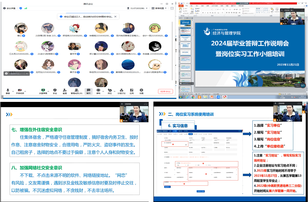 此外,针对因参加“厂中校”项目未能返校参加现场会议学习的同学,11月28日晚19:30,学院另组织了腾讯会议线上“毕业生岗位实习安全教育及系统使用培训会”,会议由解心老师主持,确保岗位实习安全教育落实到每一个学生。