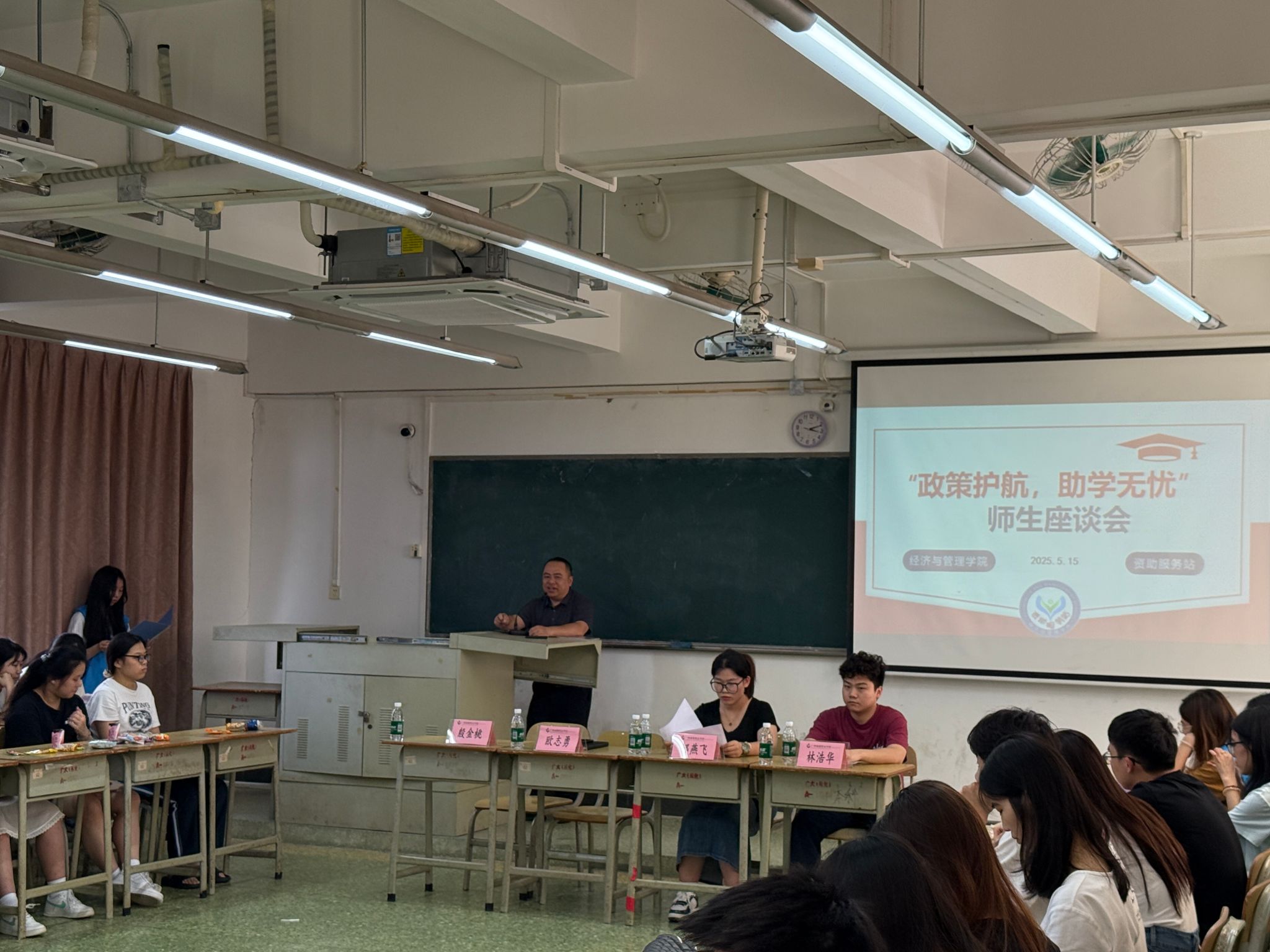 为深入推动我院国家资助政策落实工作,进一步激发学生积极性,助力经管学子保持积极向上的精神风貌。2025年5月15日下午15:00,经济与管理学院资助服务站于人文艺术楼508教室开展“政策护航,助学无忧”师生座谈会暨优秀学生分享会。出席本次座谈会的成员有经济与管理学院党委书记、副院长欧志勇、资助服务站指导老师殷金桃、优秀学生代表邹燕飞、林浩华,资助服务站全体学生干部以及学院2023级受资助学生。