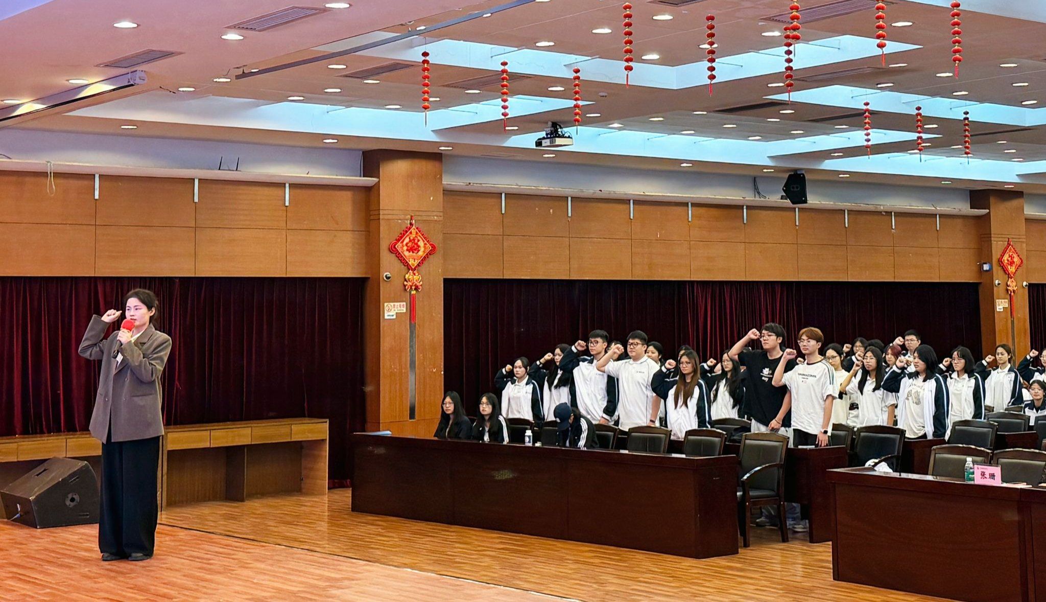 动员令下,群情振奋。大会进入充满仪式感的“2026年参赛师生宣誓”环节。在王雪老师的带领下,拟参赛学生们意气风发,庄严宣誓。铿锵有力的誓言在报告厅回荡,表达了他们无畏挑战、奋勇争先的坚定决心。