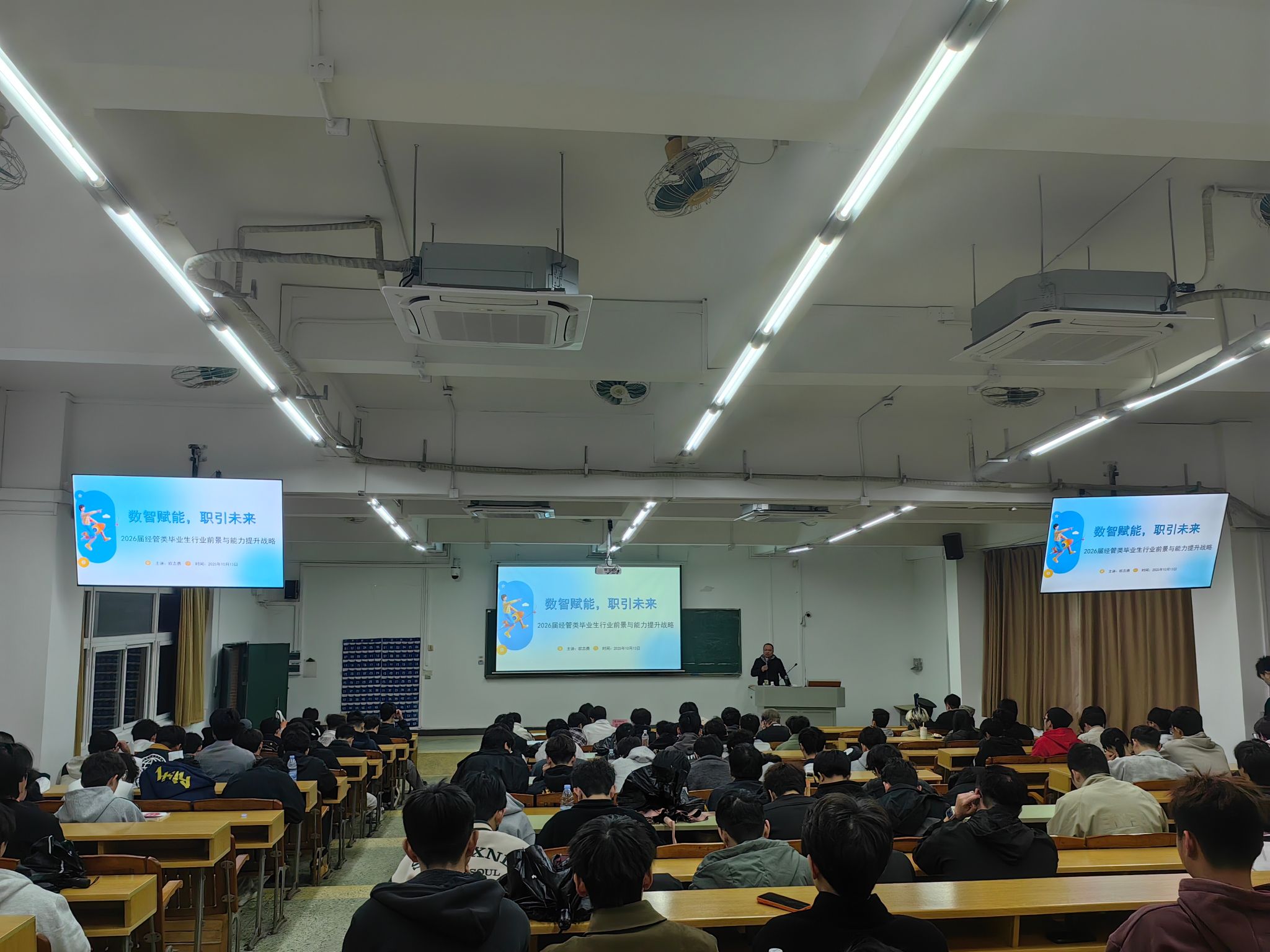 为帮助2026届毕业生准确把握数智时代行业变革趋势,科学规划职业发展,10月13日晚,经济与管理学院在人文艺术楼126教室举办了以“数智赋能,职引未来”为主题的就业指导讲座,为即将踏入职场的学子们提供了一份实用的“职业导航指南”。本次讲座由学院党委书记、副院长欧志勇主讲,2026届毕业生积极参与。