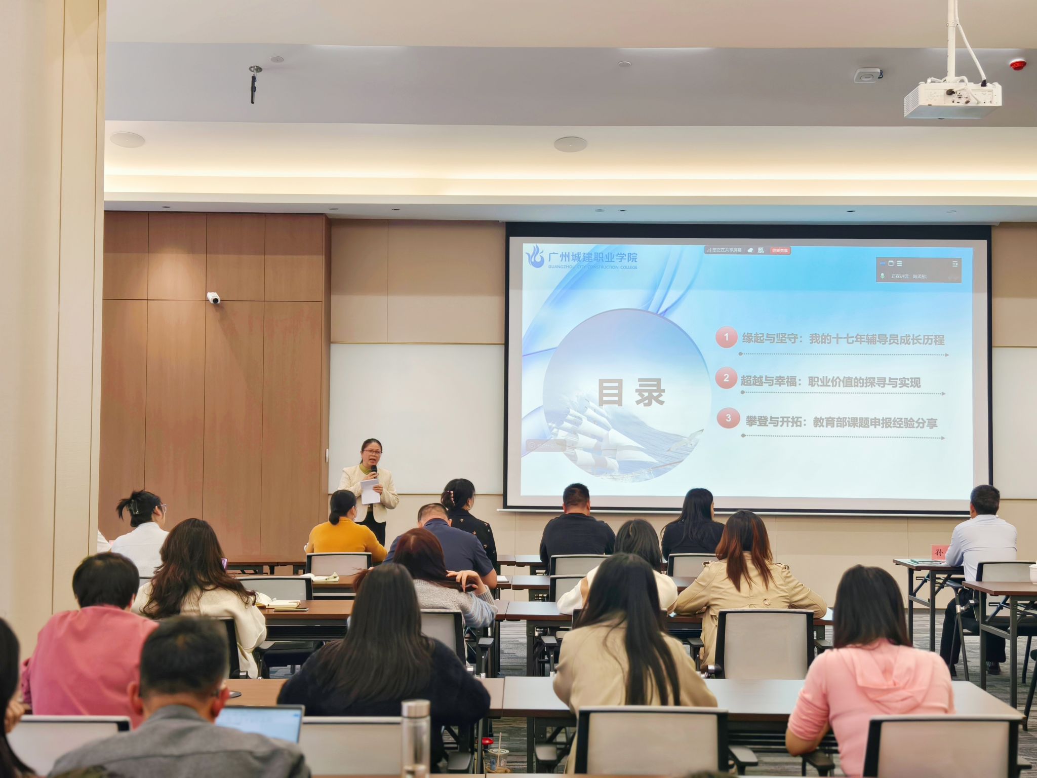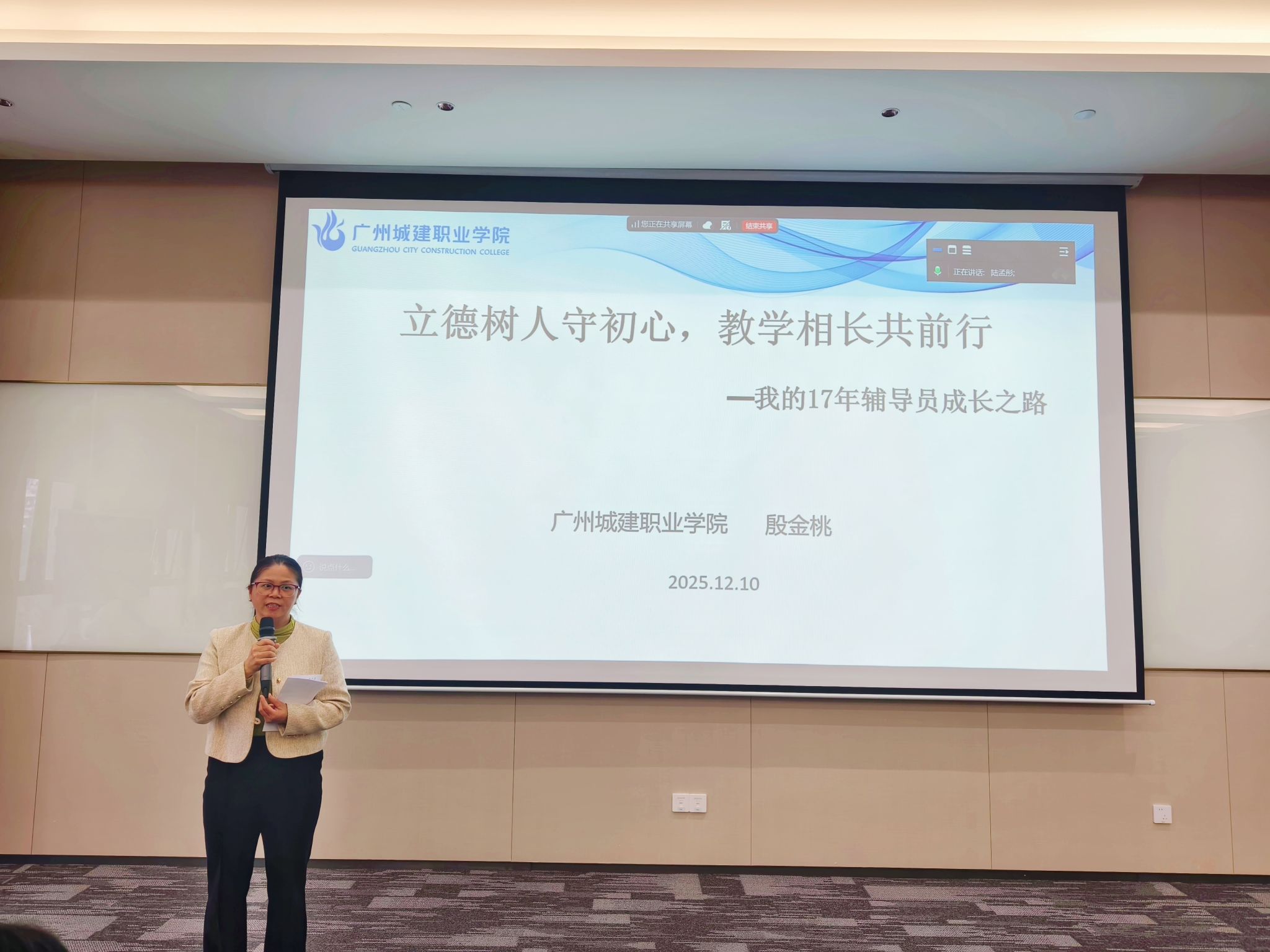 为加强校际学生工作交流,促进辅导员队伍专业化成长,12月10日,我校辅导员殷金桃受邀到广州华商职业学院为全体辅导员进行“立德树人守初心,教学相长共前行”的专题培训。本次培训旨在通过分享长期一线的实践感悟与科研突破经验,坚定青年辅导员的职业信念,赋能其职业发展路径。