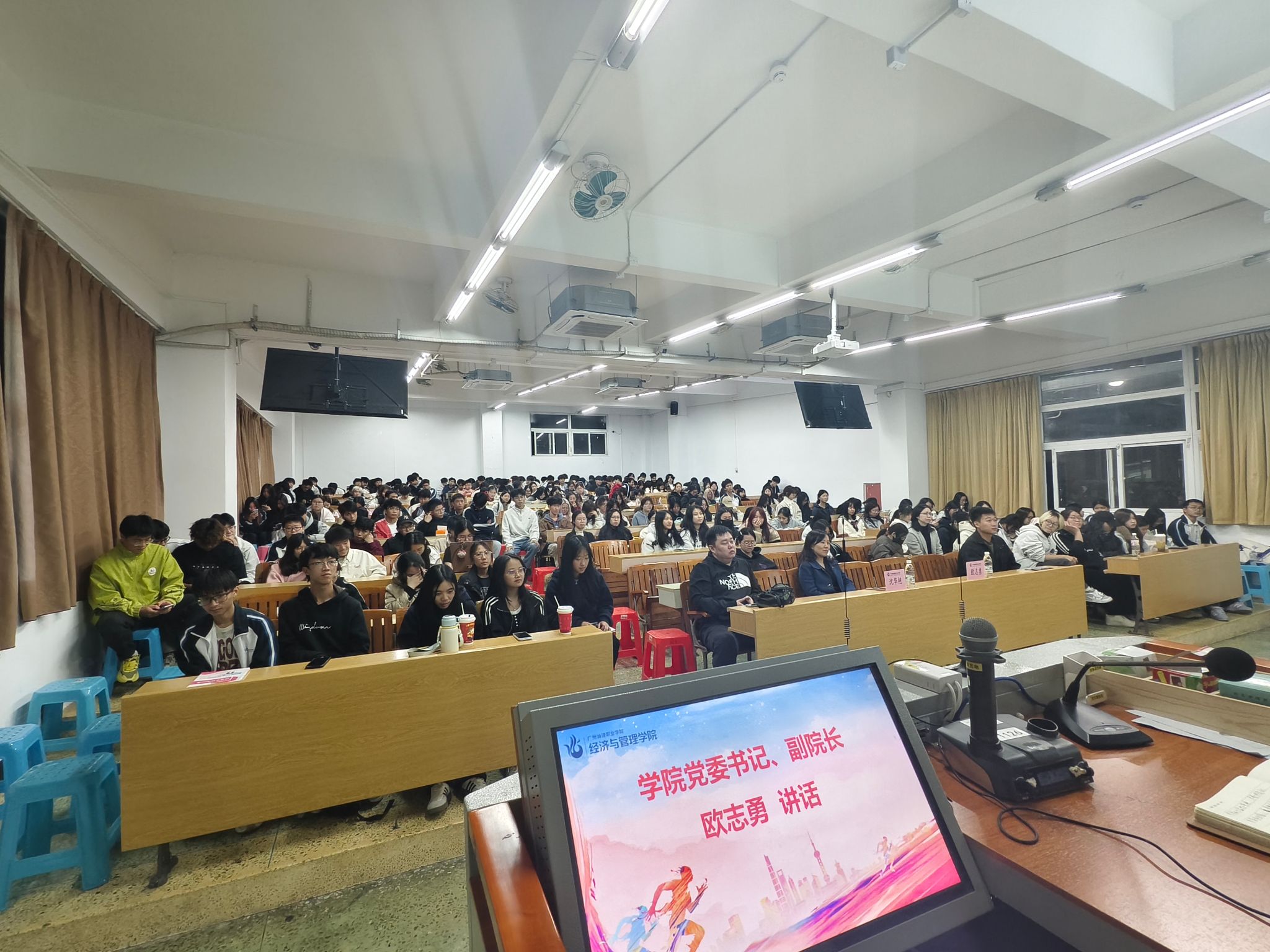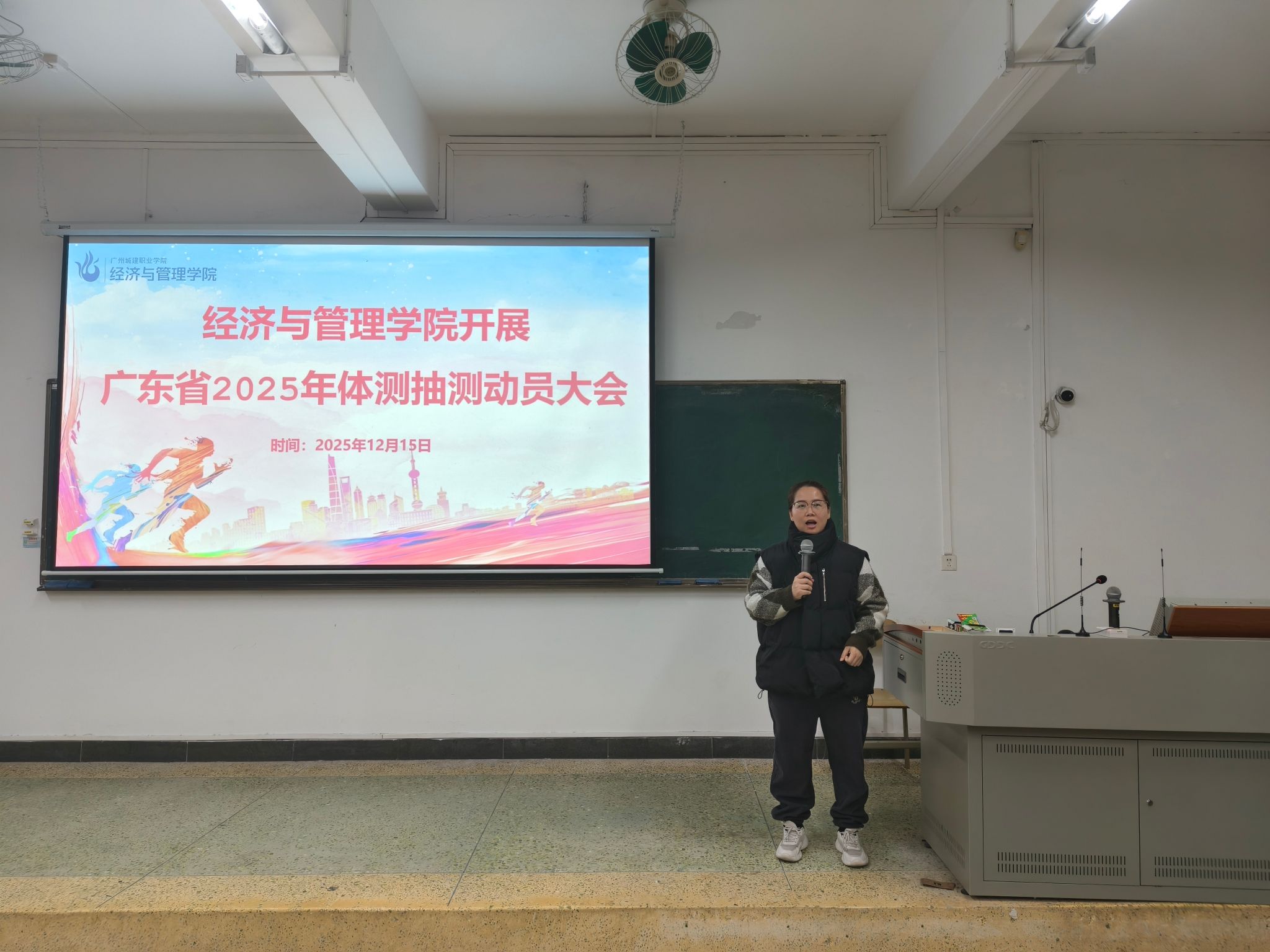 12月15日晚,经济与管理学院于人文艺术楼126课室召开2025年广东省学生体质健康抽测工作动员大会。院长沈华艳、学院党委书记兼副院长欧志勇出席会议,学院全体2025级辅导员以及即将参加抽测的330名学生代表参会,大会由朱咏娟老师主持。