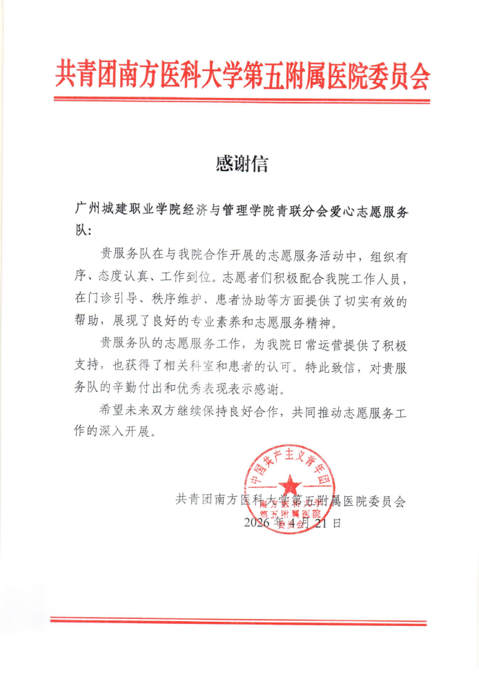 4月21日,共青团南方医科大学第五附属医院委员会特意发来感谢信,对经济与管理学院青联分会爱心志愿服务队在医院门诊志愿服务中的出色表现,给予高度肯定与诚挚感谢。