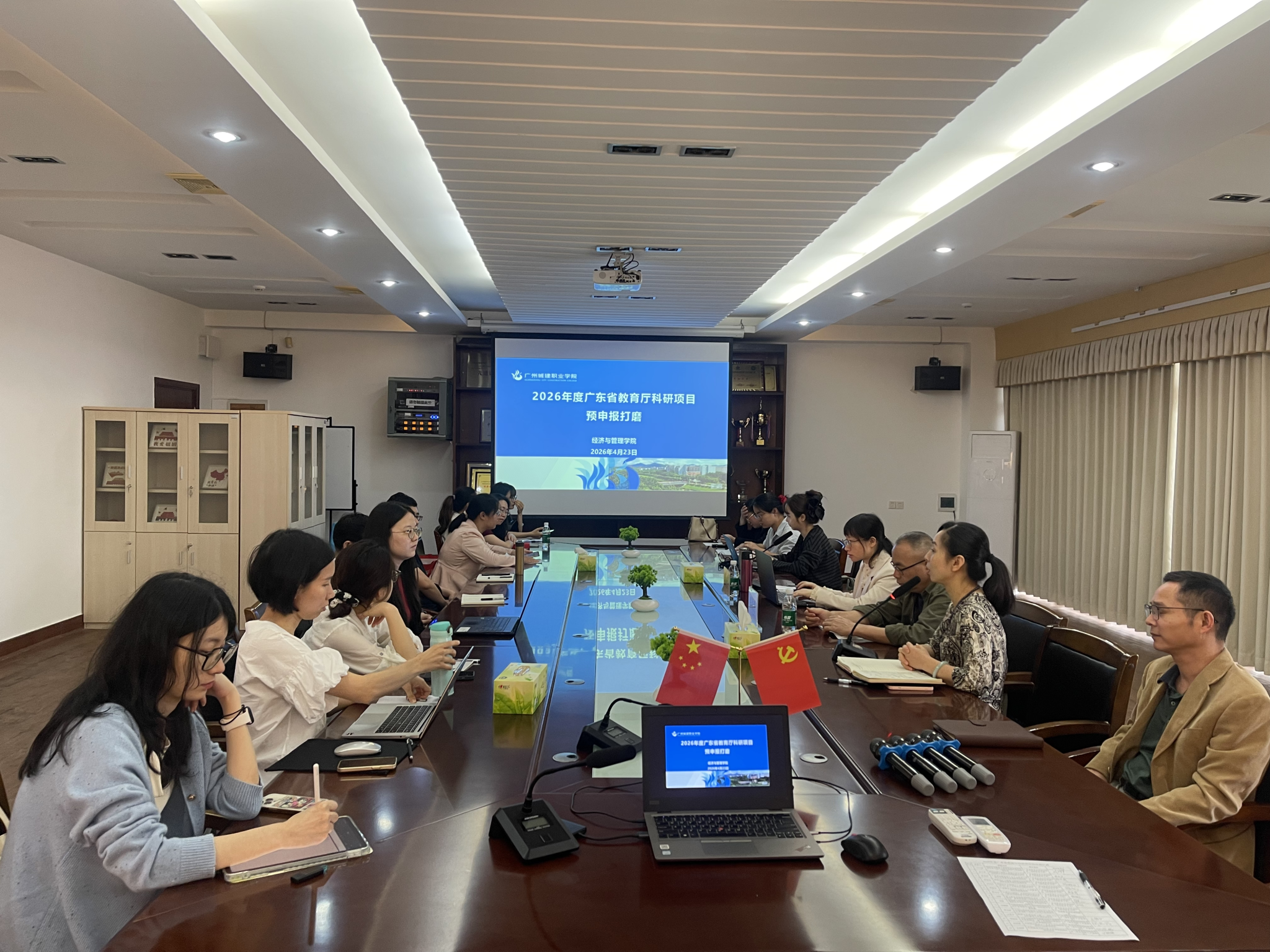 4月23日下午,经济与管理学院顺利召开2026年度广东省教育厅科研项目预申报打磨会。本次会议特邀校外专家张成科教授、校内专家王爱文教授担任评议专家,各项目负责人及核心成员参加了会议,会议围绕15项预申报课题开展集中指导与精细打磨。