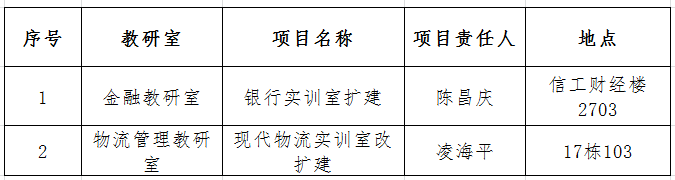 为满足高素质技术技能人才培养的需求,进一步加强实验实训室建设,改善实验实训条件,按照《[教务通20-093]关于申报2021年度实验实训室建设项目的通知》要求,各教研室共申报2个建设项目。为加强项目的必要性、合理性和可行性论证,学院定于2020年10月28日下午14:30在人文艺术楼1631召开2021年实训室建设项目论证答辩会议,本次参加论证的有金融教研室和物流管理教研室,请相关单位提前做好准备,按时参加会议(具体安排详见下表)。