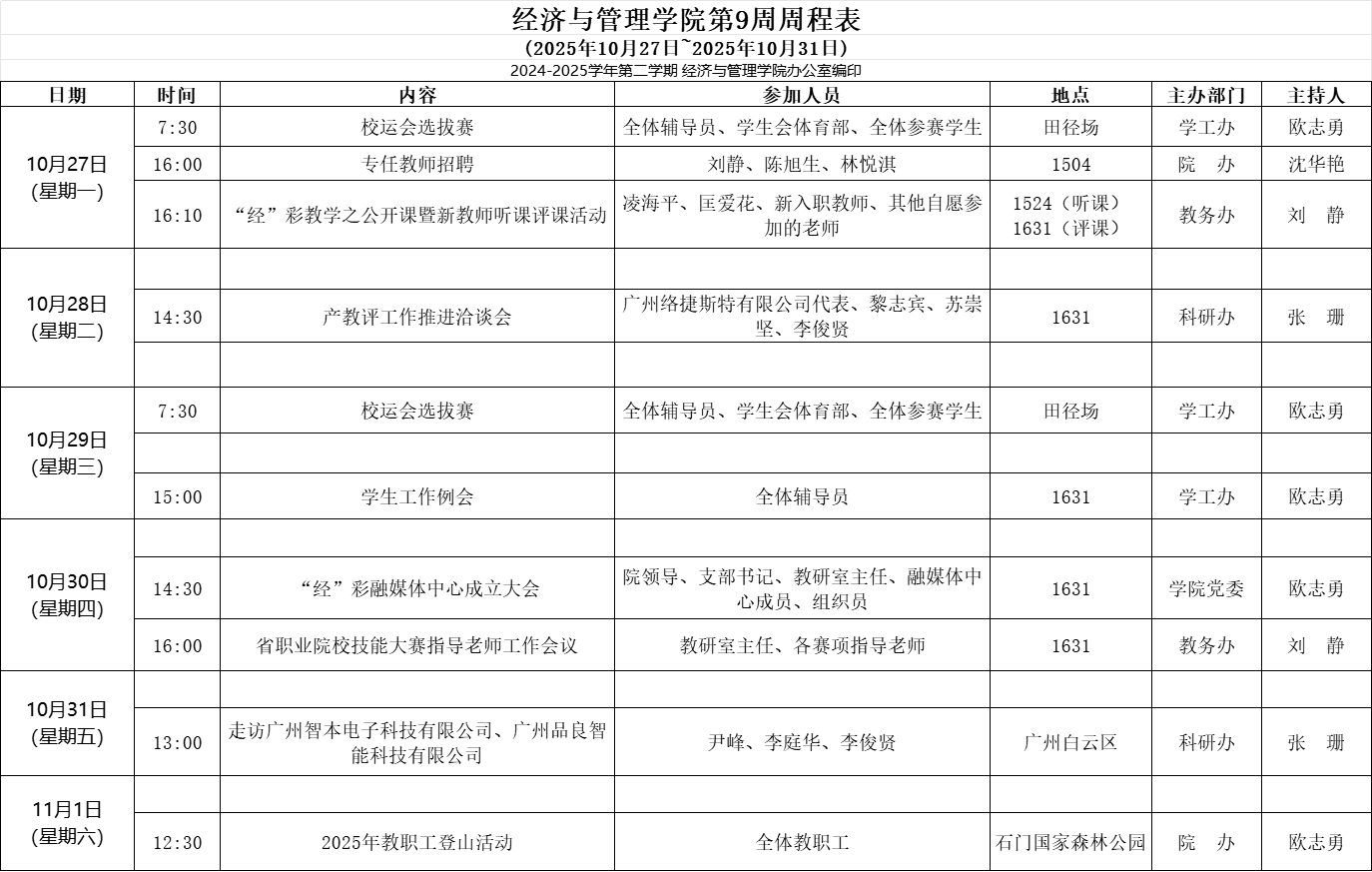 【2025-2026-1】经济与管理学院第9周周程表