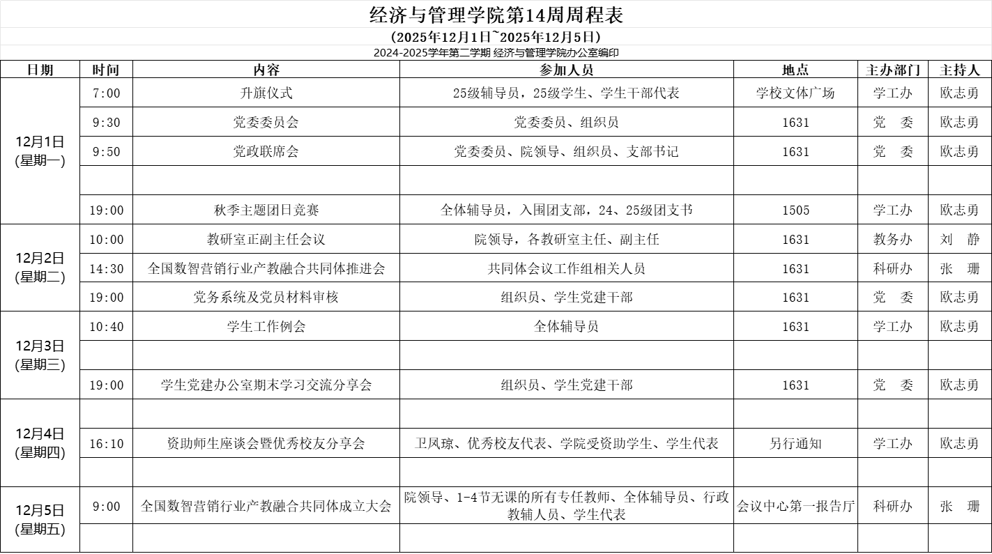 【2025-2026-1】经济与管理学院第14周周程表